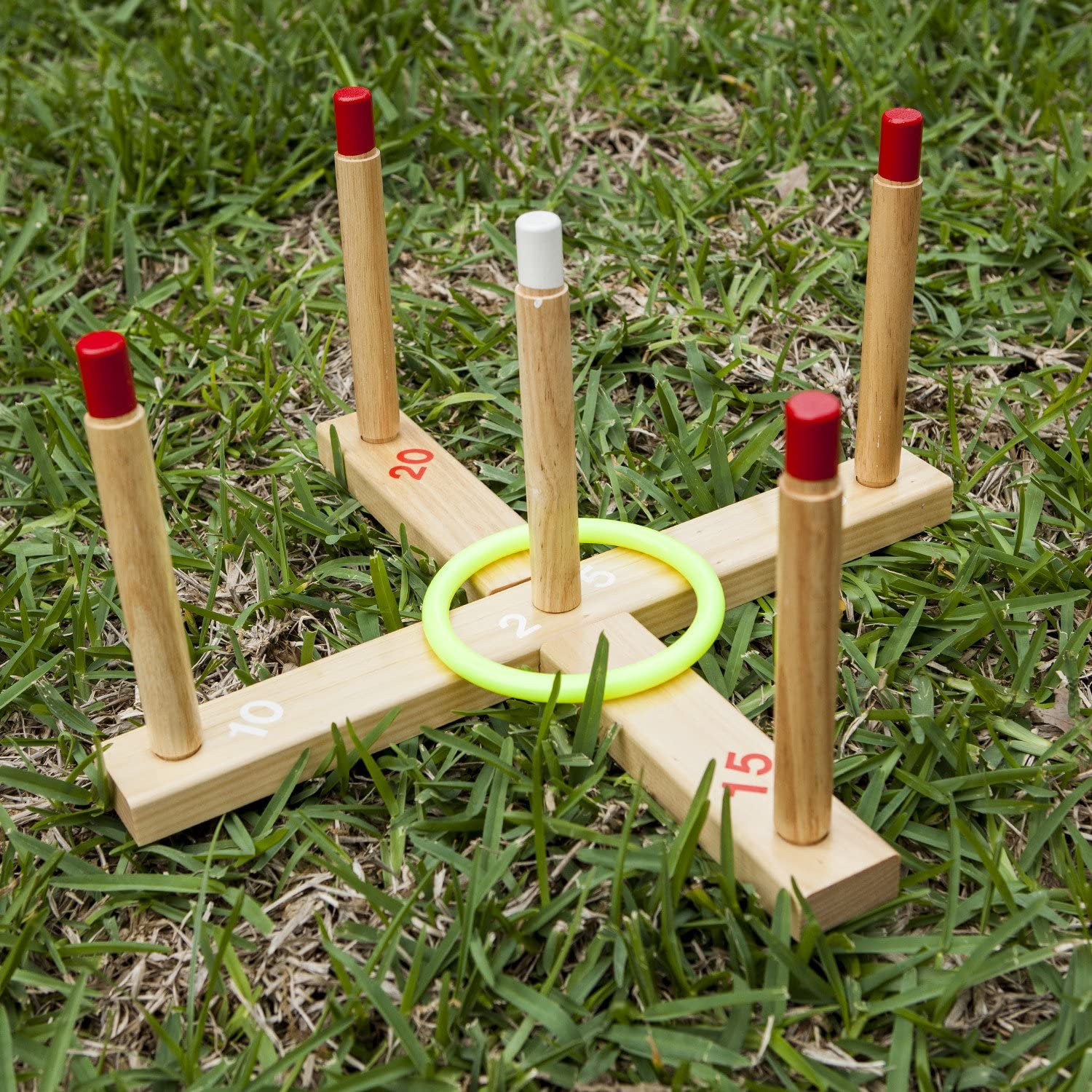 BRIGHT, VIBRANT DESIGN: With durable bright plastic rings with plastic connectors and scoring pegs on the wooden base, this ring toss set is designed for maximum visibility Large numbers on the base also make it easy to keep score and aim