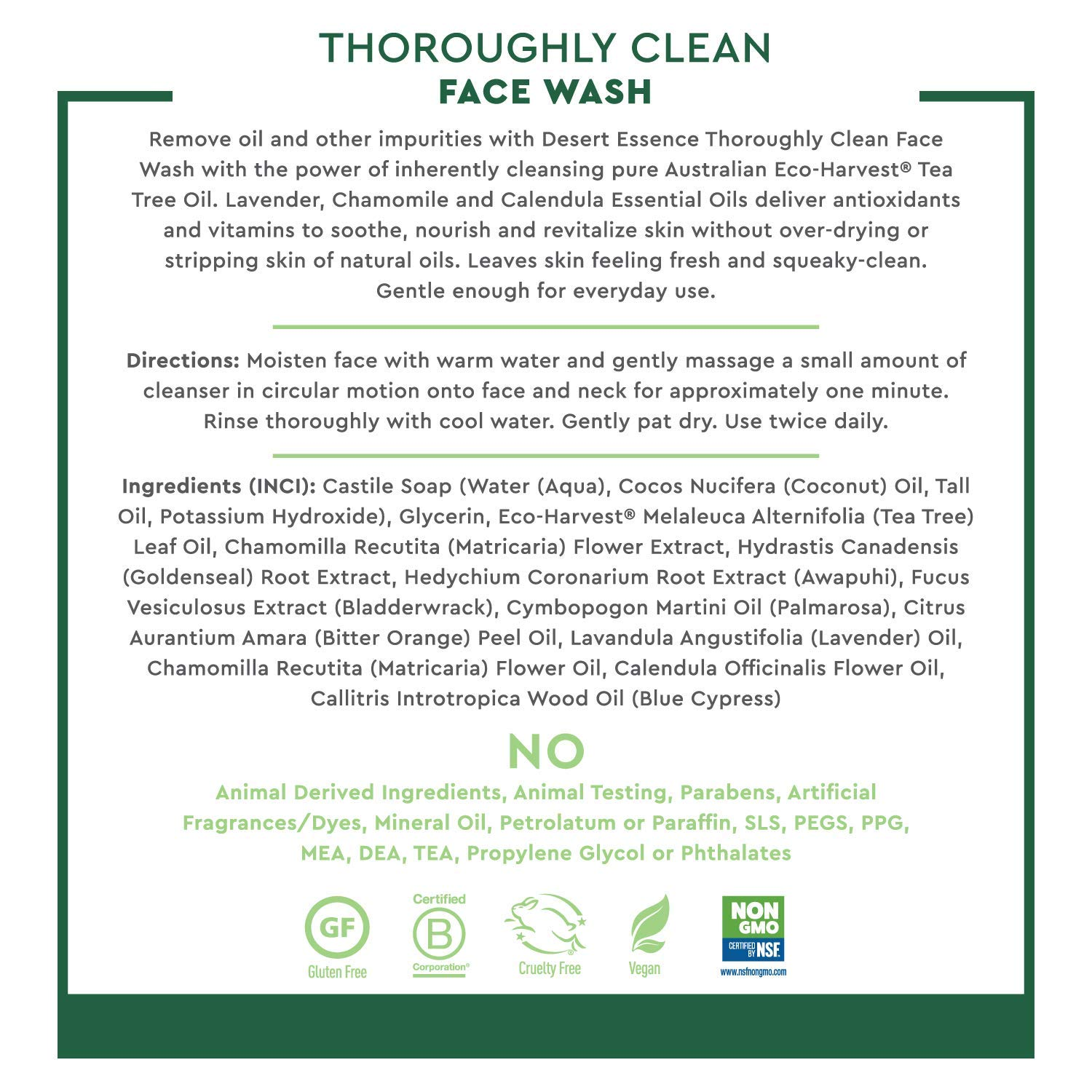 1;Desert Essence thoroughly Clean Face Wash is a gentle cleansing solution that leaves your skin feeling clean and silky. This unique face wash contains all natural Tea Tree Oil, a natural antiseptic. Included also are extracts of Goldenseal, Hawaiian White Ginger (awapuhi) and the essential oil of Swiss Chamomile (matricaria), Mineral-rich Bladderwrack, harvested from the sea, nourishes the skin to leave it looking vibrantly healthy. Thoroughly Clean Face Wash ever so gently helps impro