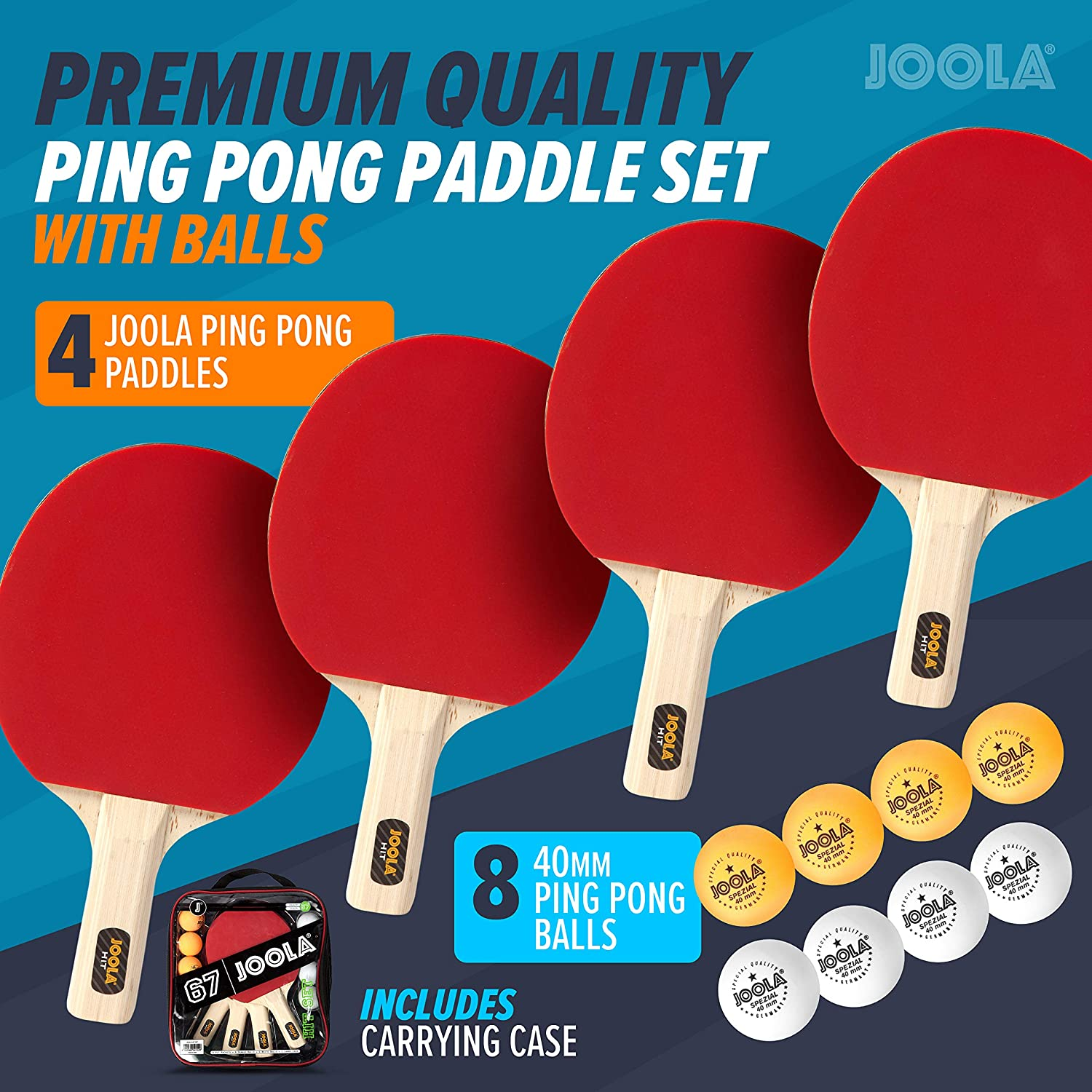 PREMIUM QUALITY PING PONG PADDLE SET WITH BALLS: This ping pong racket set includes everything needed to play table tennis. Includes 4 JOOLA ping pong paddles, 4 White and 4 Orange Ping Pong Balls for competitive play, along with a carrying case.