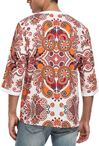 LecGee Men's Casual Cotton Linen Shirt Short Sleeve V Neck Tie Hippie Beach Tee Yoga Summer Top